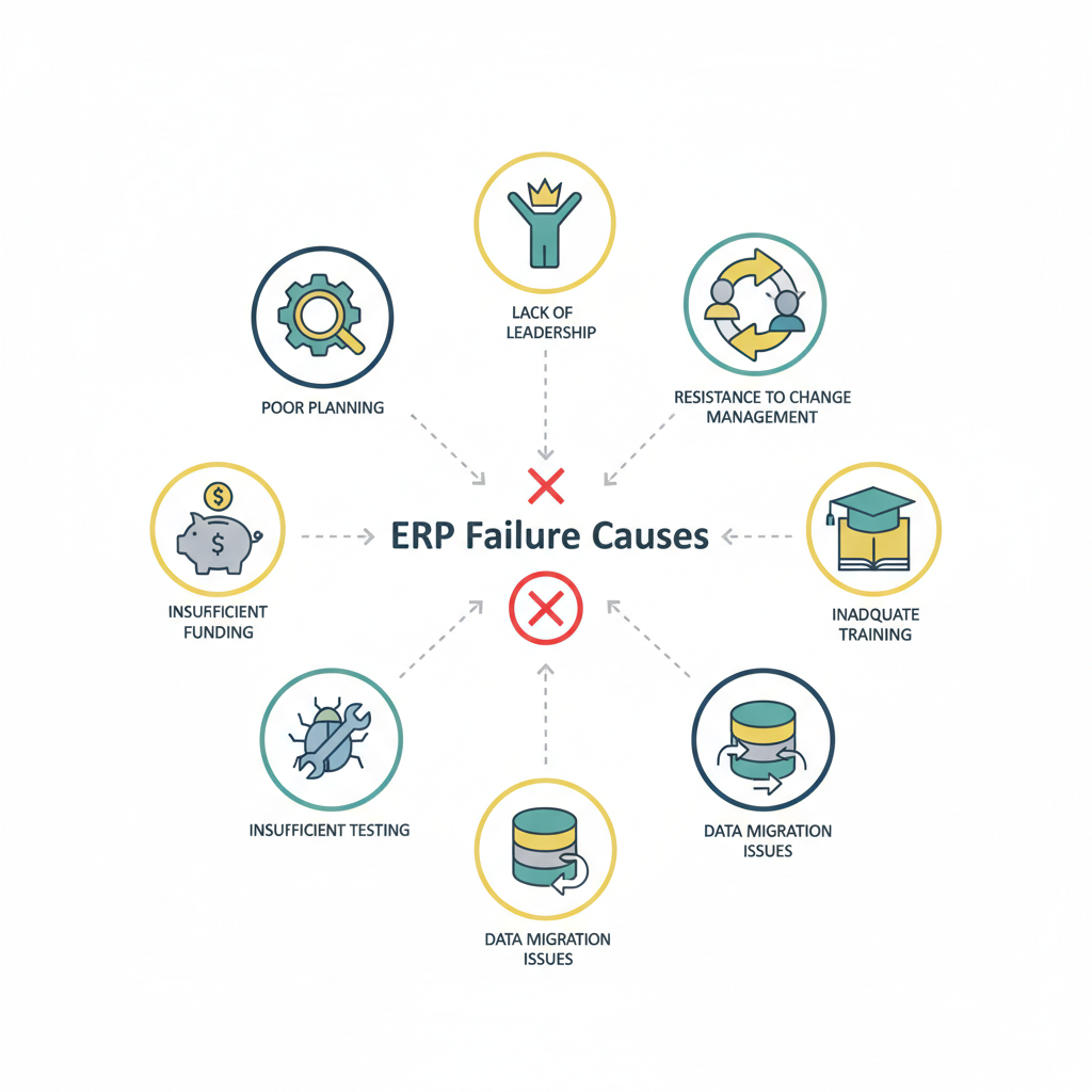 To avoid these pitfalls, it is crucial to understand the common causes of ERP failures, which typically stem from inadequate planning, insufficient funding, unrealistic expectations, and a lack of training and support.