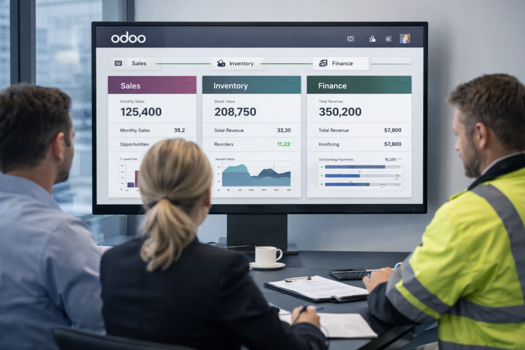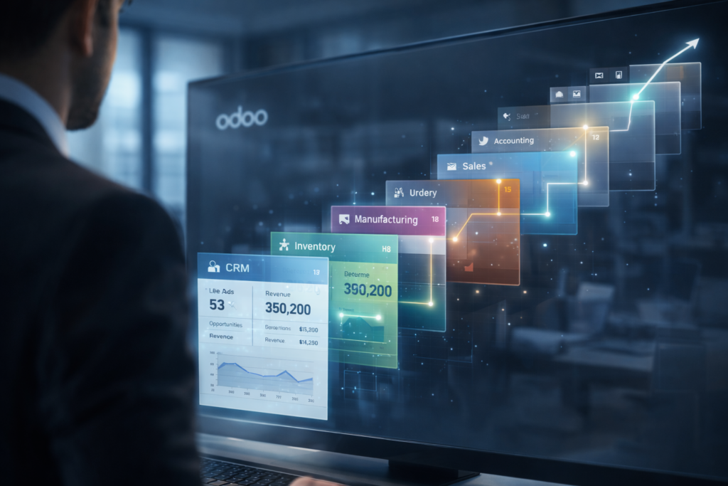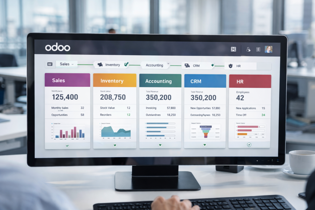 Odoo ERP is a fully integrated enterprise resource planning (ERP) system designed to simplify daily business operations. Instead of using separate software for sales, inventory, accounting, and reporting, Odoo integrates all departments into a single unified system.